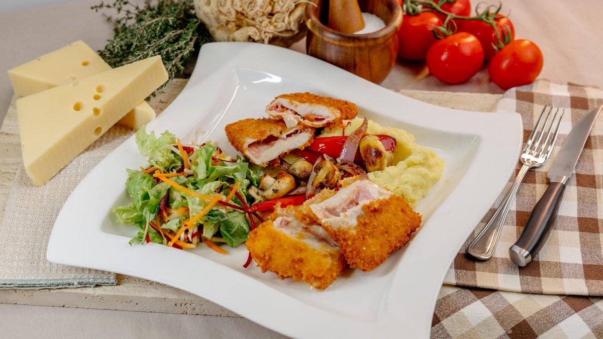Pohovana Palačinka spaja domaću tradiciju i moderan gurmanski stil. Puni se bogatom mešavinom pavlake, trapista, dimljenog vrata, pršute i šunke, a zatim se uvalja u panko prezlu i prži do savršene hrskavosti. Lagana žilijen salata osvežava svaki zalogaj, dok naš domaći tartar preliv daje kremastu i blago kiselkastu završnicu. Elegantno, toplo predjelo koje ostavlja snažan utisak.