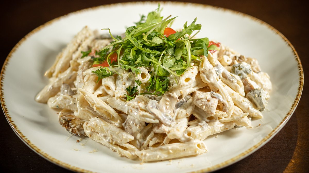 belo meso, šampinjoni, kornišoni, praziluk, makarone, majonez, pavlaka, susam