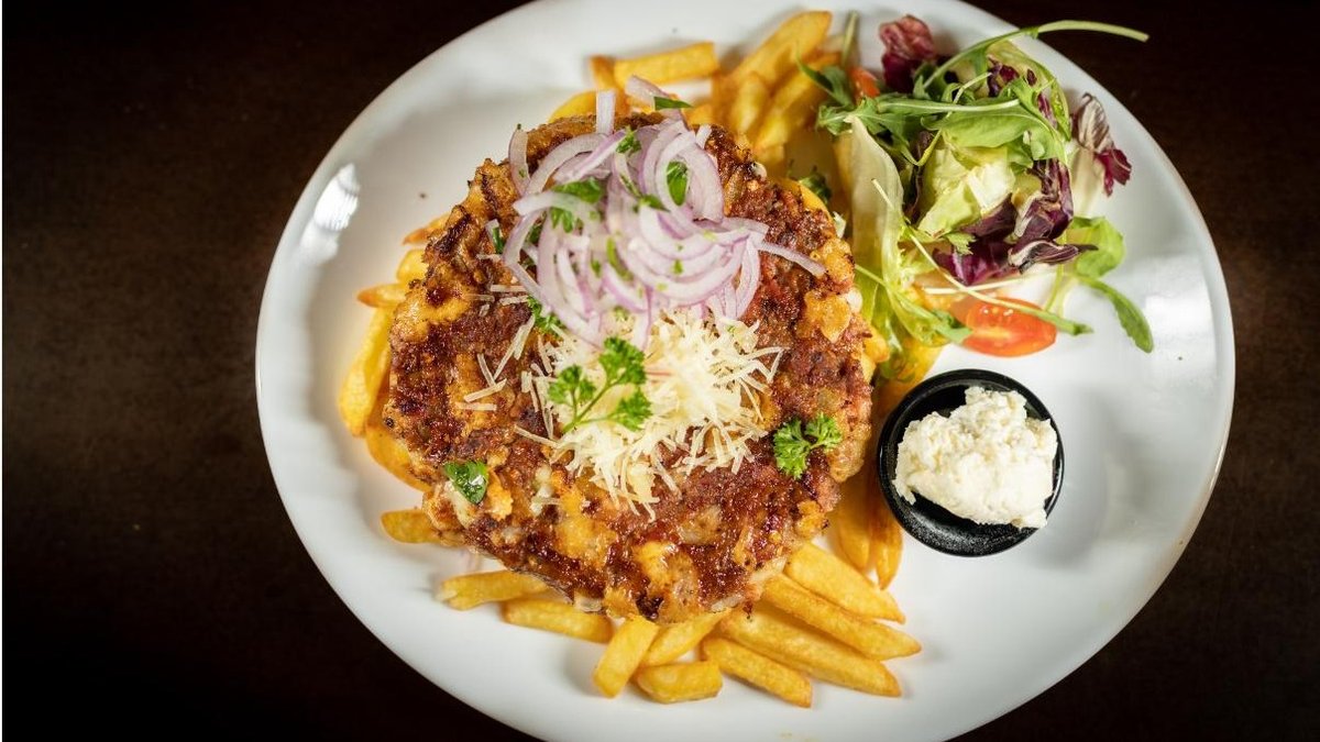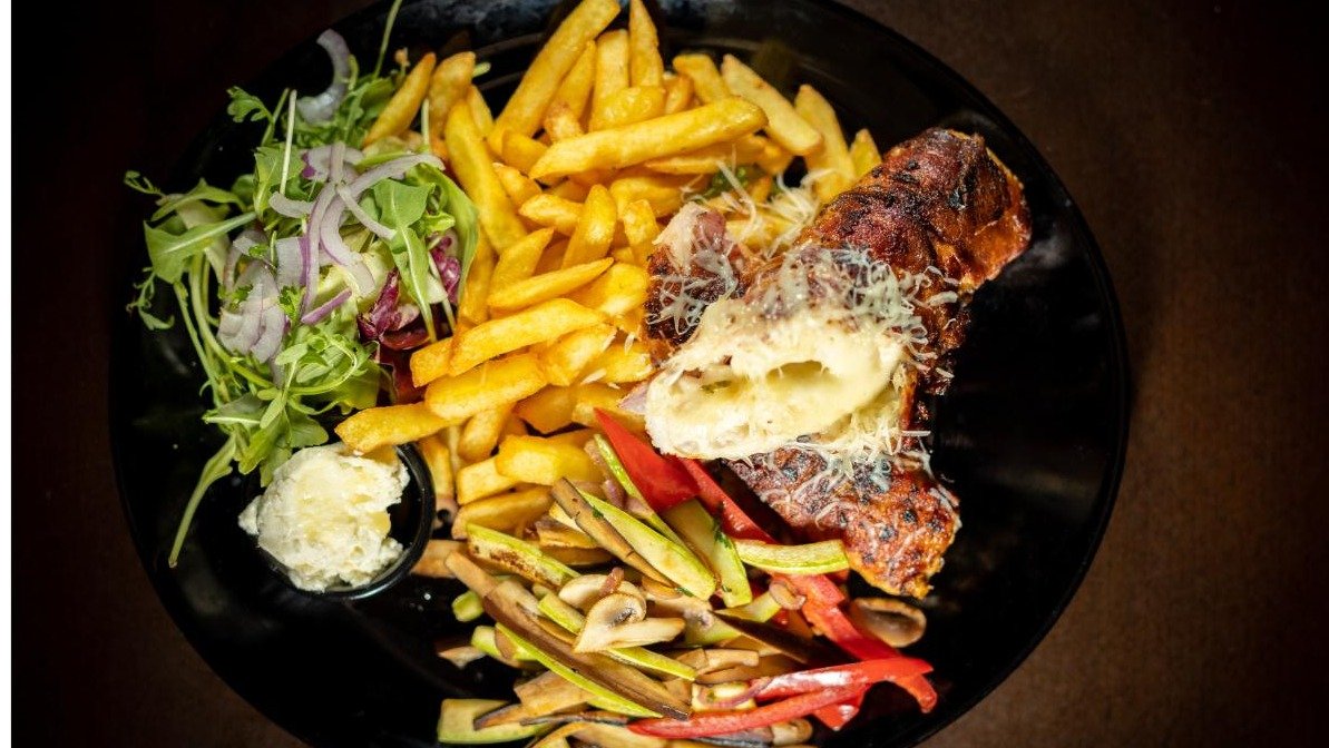 punjena pljeskavica sa kajmakom i sirom, luk, pomfrit, mix zelenih