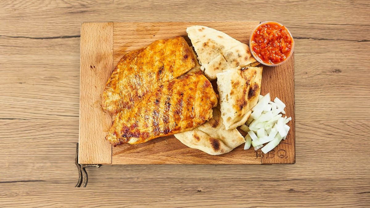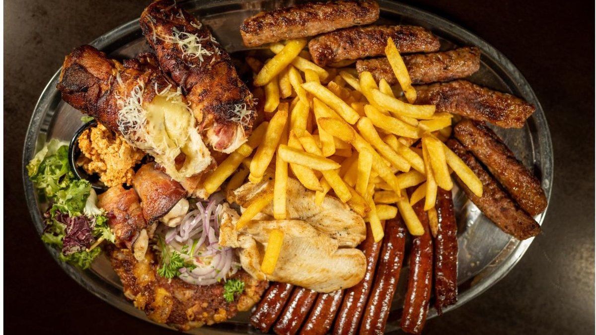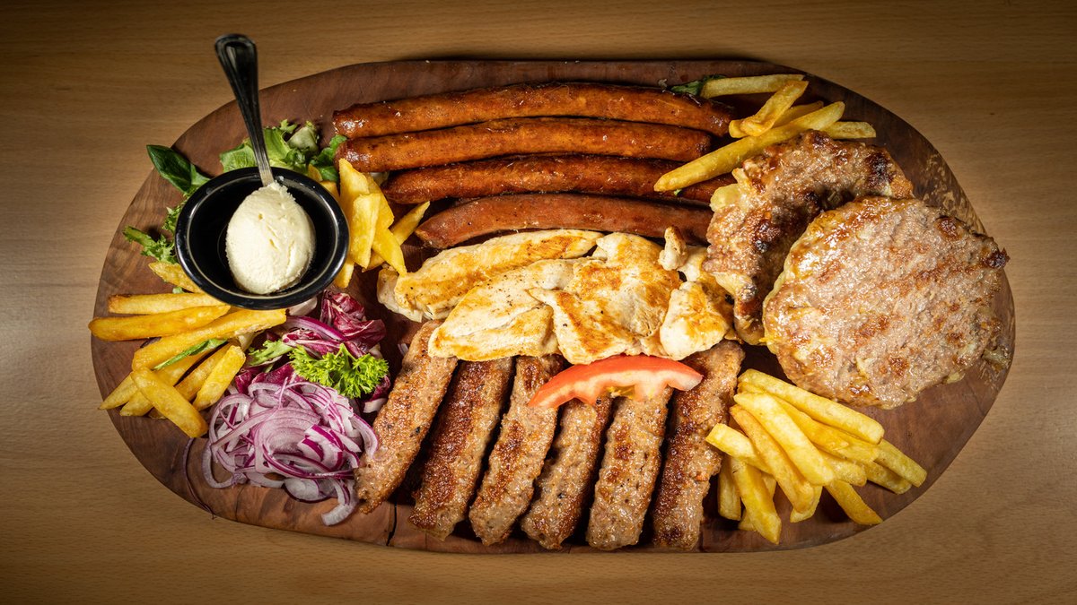 200g pljeskavica, 200g ćevapa, 150g roštiljske kobasice, 150g pileći file, 150g ražnjići, 150g pileći file punjen sa kajmakom + 4 lepinje, pomfrit, luk, lepinja kajmak i urnebes