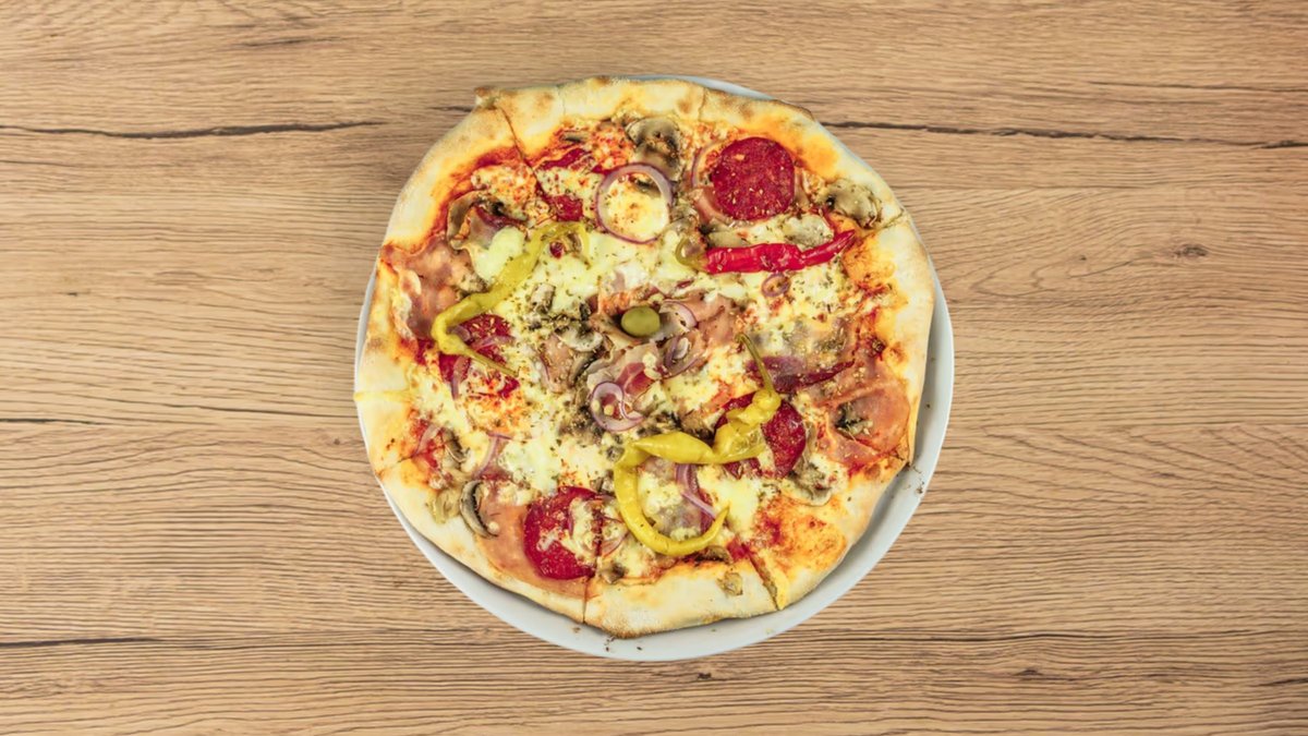 sir, šunka, šampinjoni, ljuta paprika, feferone, beli luk, masline, kečap