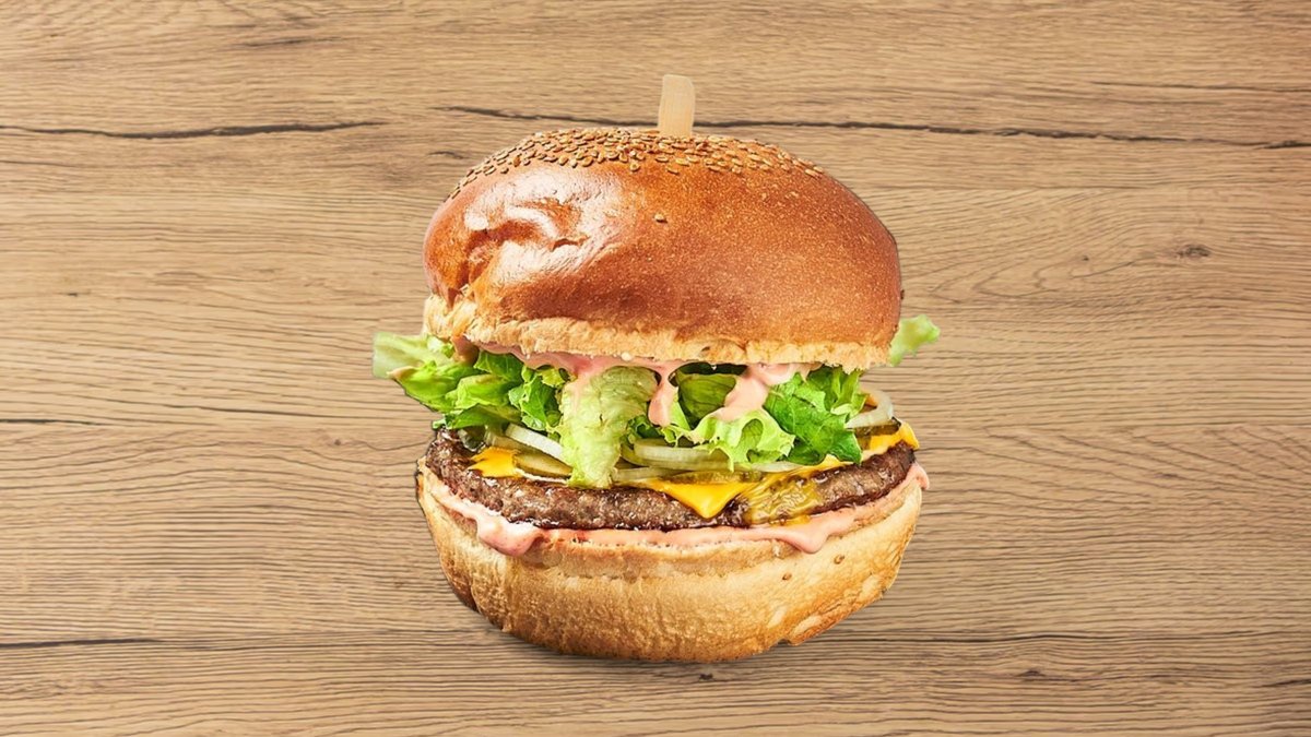 burger, kajzerica, čedar sir, zelena salata, senf, burger sos, ljubičasti luk, paradajz, kiseli krastavci, pomfrit