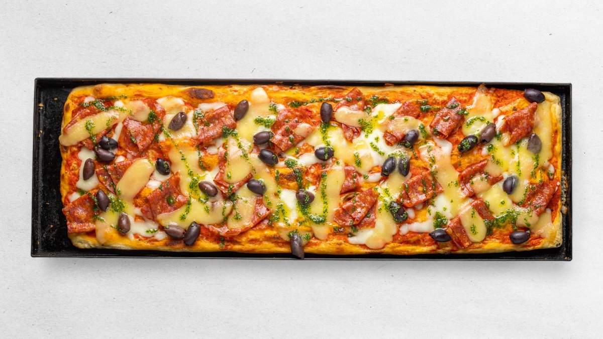 Pizza Base rossa: paradajkový základ, rímska pikantná saláma, údená scamorza, mozzarella fiordilatte, olivy, petržlenová salsa (55x19 cm → 4 kusy)