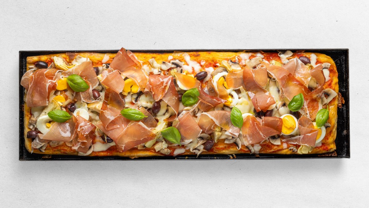 Pizza Base rossa: paradajkový základ, mozzarella fiordilatte, prosciutto crudo, šampiňóny, varené vajcia, artičoky, olivy, bazalkový olej (55x19 cm → 4 kusy)