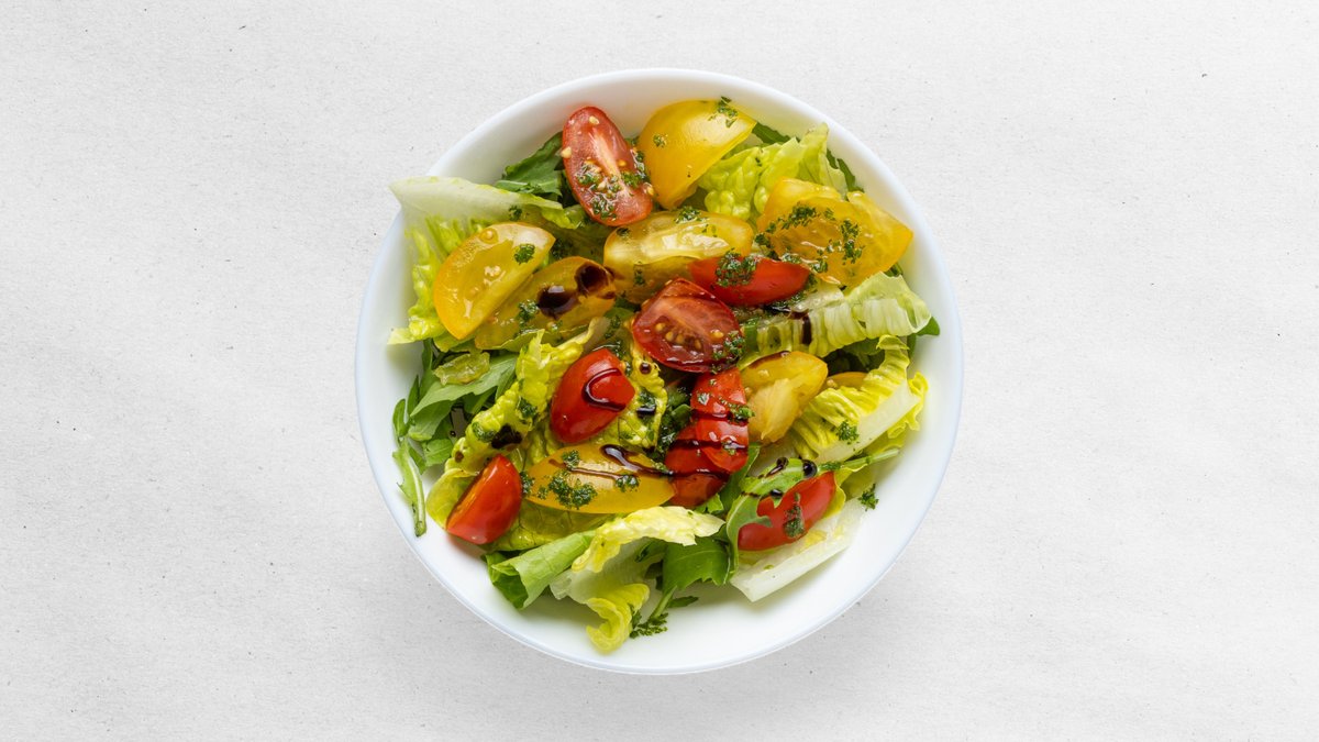 Veľký šalát s vyladeným dresingom: rímsky šalát, mozzarella guľôčky, cherry paradajky, uhorky, mrkva, kukurica, olivy, bazalka, bazalkový olej
