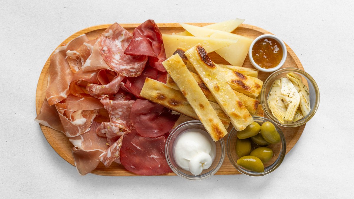 Obložená misa: prosciutto crudo, bresaola, salame finocchiona, pecorino sardo, burrata, artičoky, olivy Cerignola, džem ...podávame s pizza bianca ✓