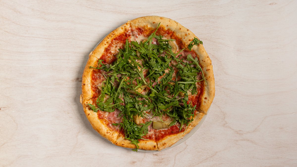 pomodoro, mozzarella, šunka, artičoky, rukola 450g / obsahuje: 1, 7, 12