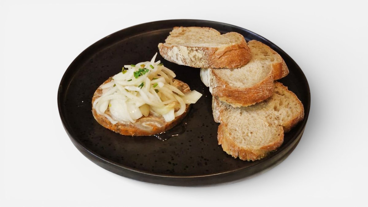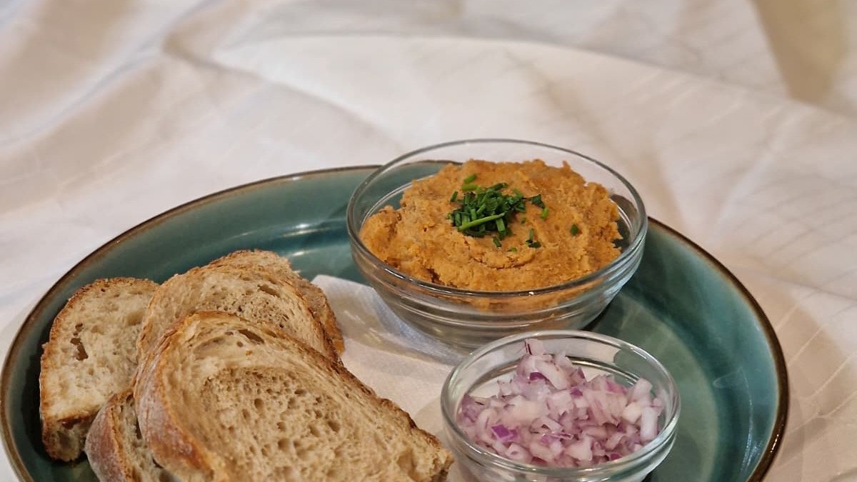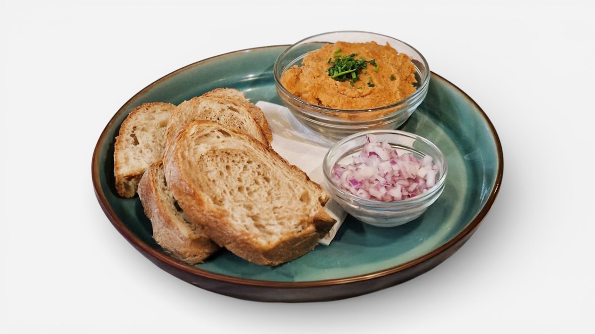 Oškvarková pomazánka s domácim chlebom, červenou cubuľkou a pažitkou 150g /1,3/