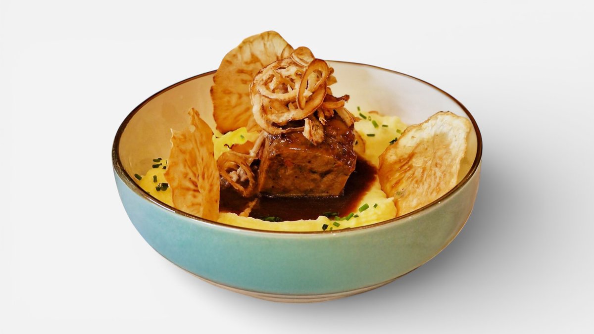 Bravčové líčka na demi-glace omáčke so zemiakovou kašou a zelerovým chipsom, viedenská cibuľka 450g /1,7/