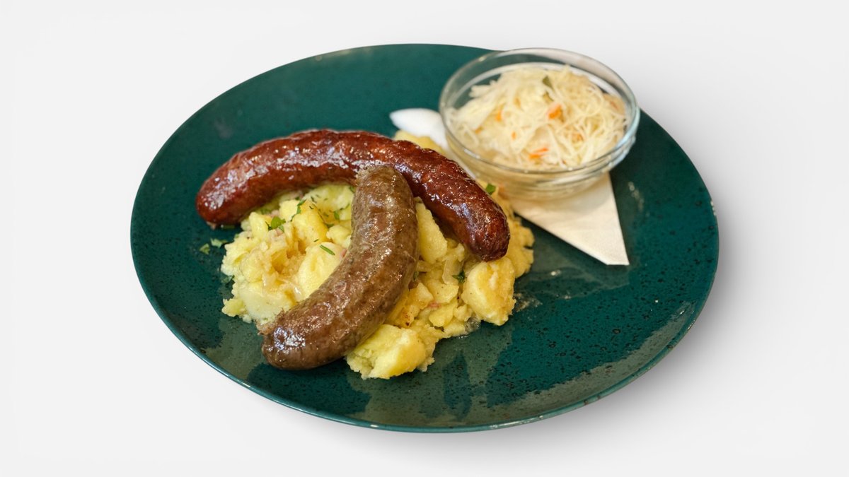 Jaternica s klobáskou, šťuchané zemiaky, čalamáda 400g /1/