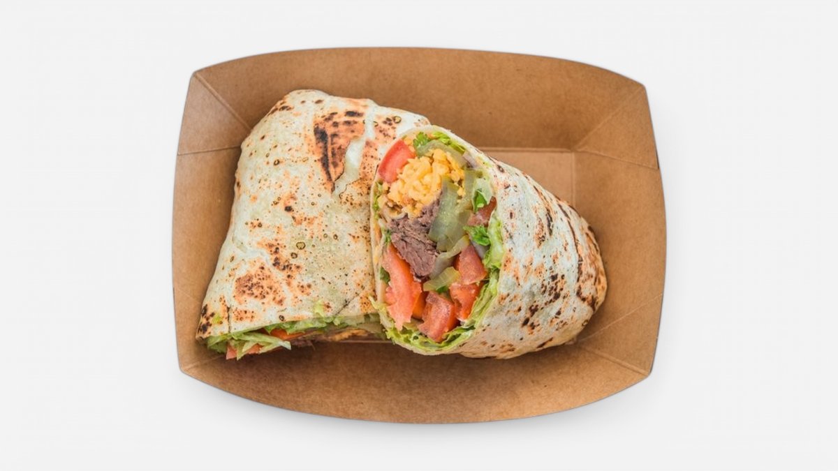 Pšeničná tortilla, ryža, fazuľa, pomaly pečené hovädzie mäso, paradajková salsa (obsahuje koriander, červenú cibulu), cheddar syr, guacamole (obsahuje koriander, cibulu, paradajku), smotana, koriander, smažená cibulka, jalapeños, sriracha (pikantná omáčka), šalát. / obsahuje alergény: 1,7