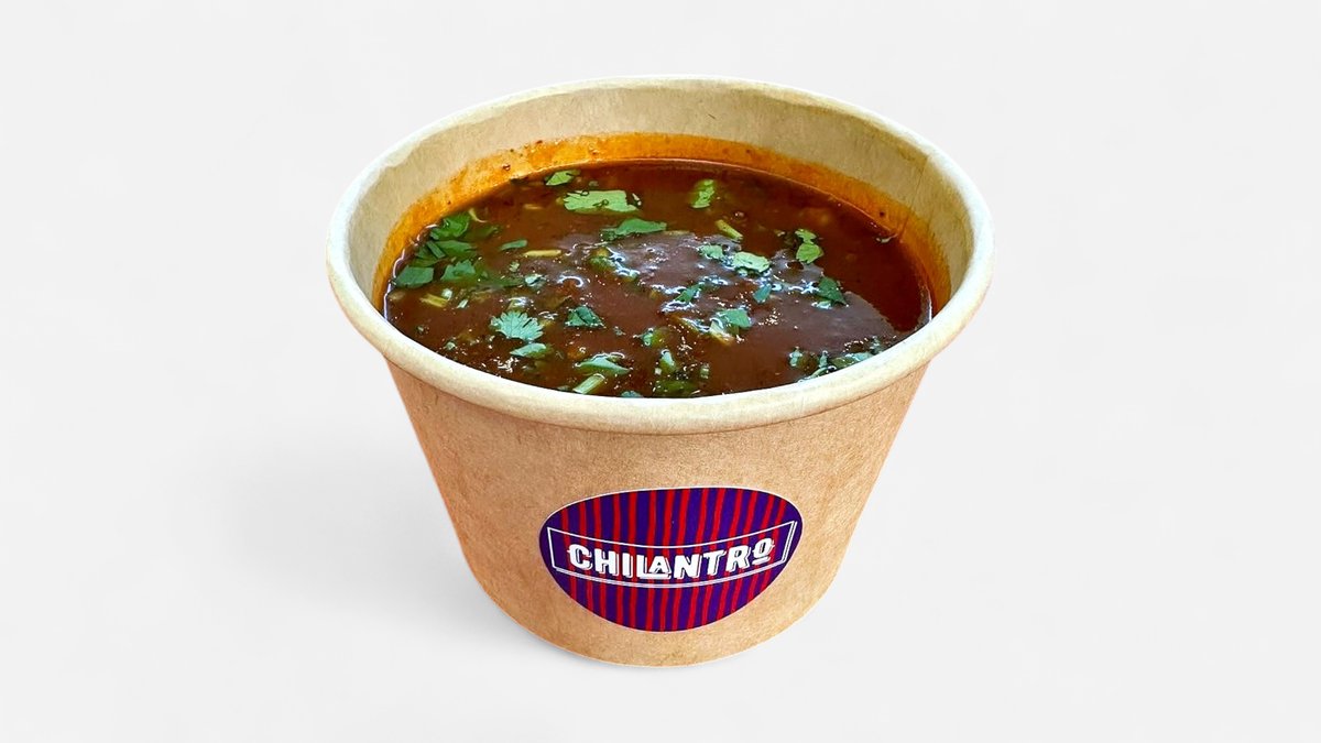 Jemne pikantná polievka s guajillo chilli, fazuľou, hominy kukuricou a paprikou, koriander / obsahuje: 9