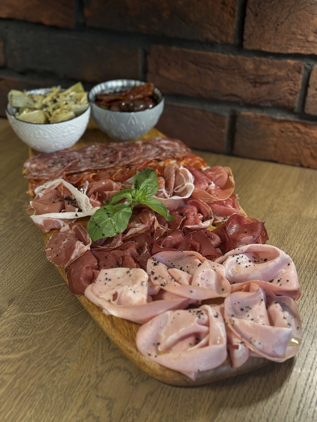 San Daniele šunka, mortadela, bresaola, spianata piccante, coppа, saláma Napoli, olivy, artičoky, sušené paradajky