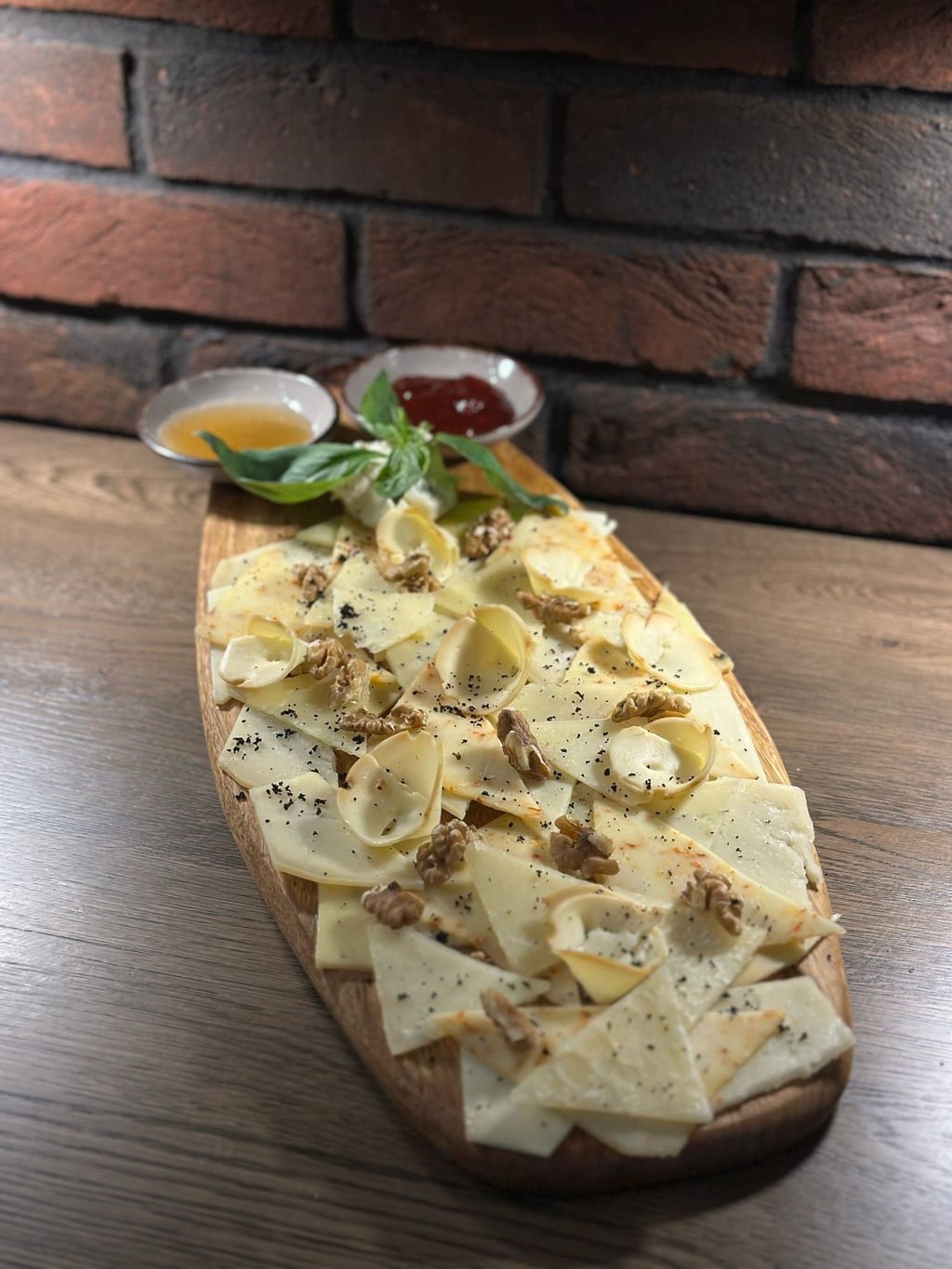 Grana padano, pecorino romano, pecorino piccante, provolone, pepato fresco, asiago, gorgonzola. Podávané s medom, džemom a orechami