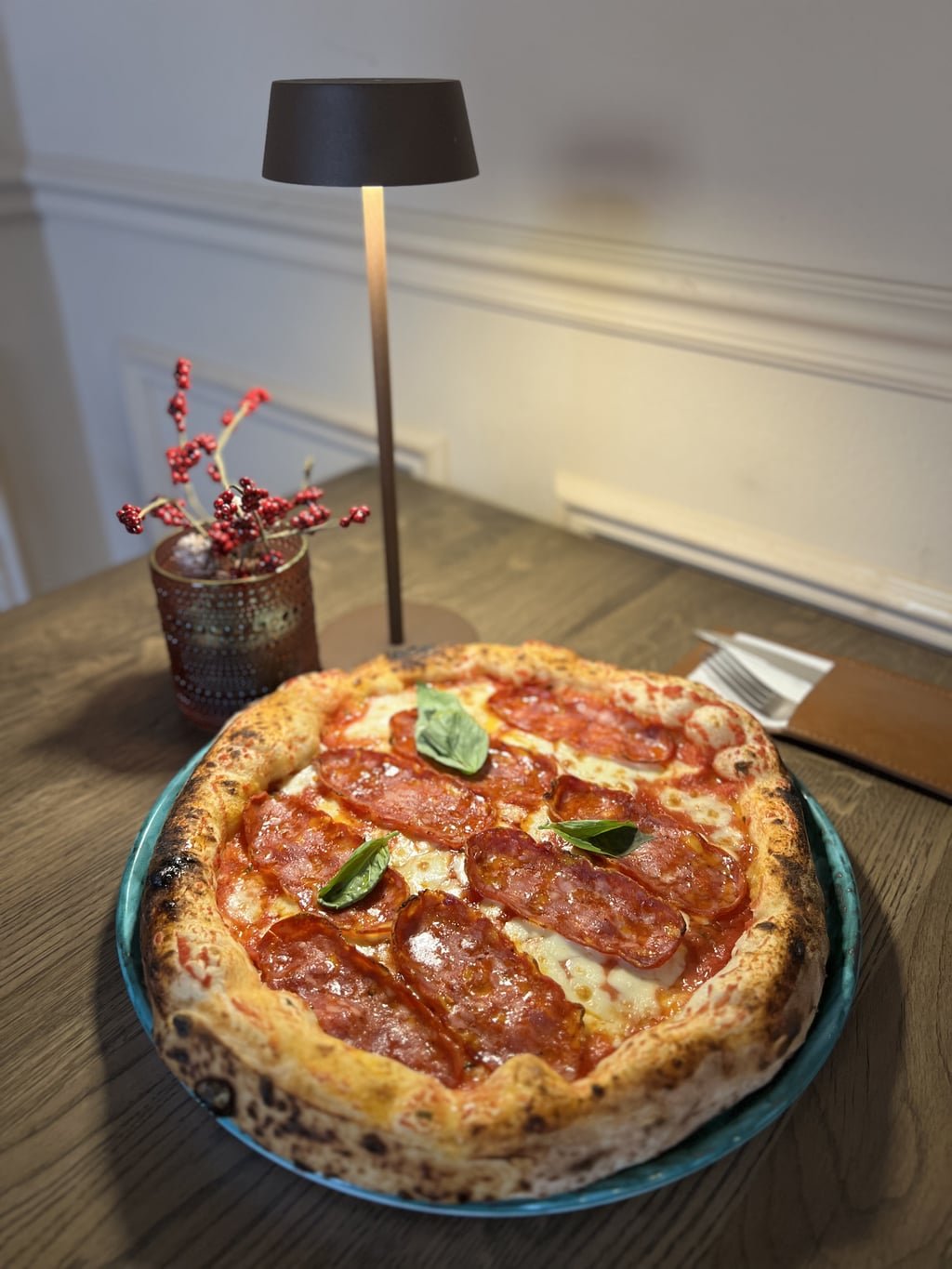 Paradajková omáčka, fior di latte, olivy, pikantná saláma Napoli, extra panenský olivový olej, bazalka