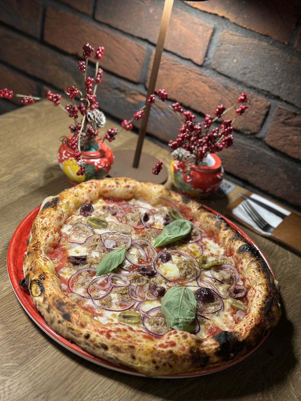 Paradajková omáčka, mozzarella, tuniak, cibuľa, olivy, extra panenský olivový olej, bazalka