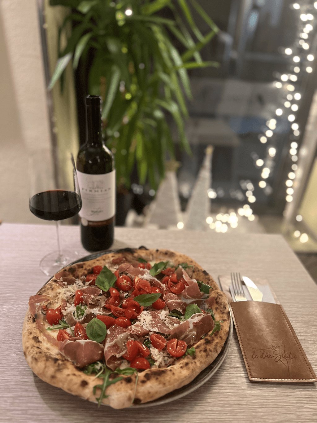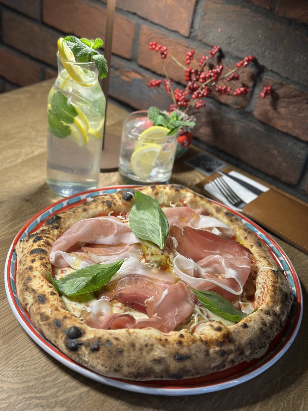 Paradajková omáčka; po upečení San Daniele šunka, cherry paradajky, burrata, extra panenský olivový olej
