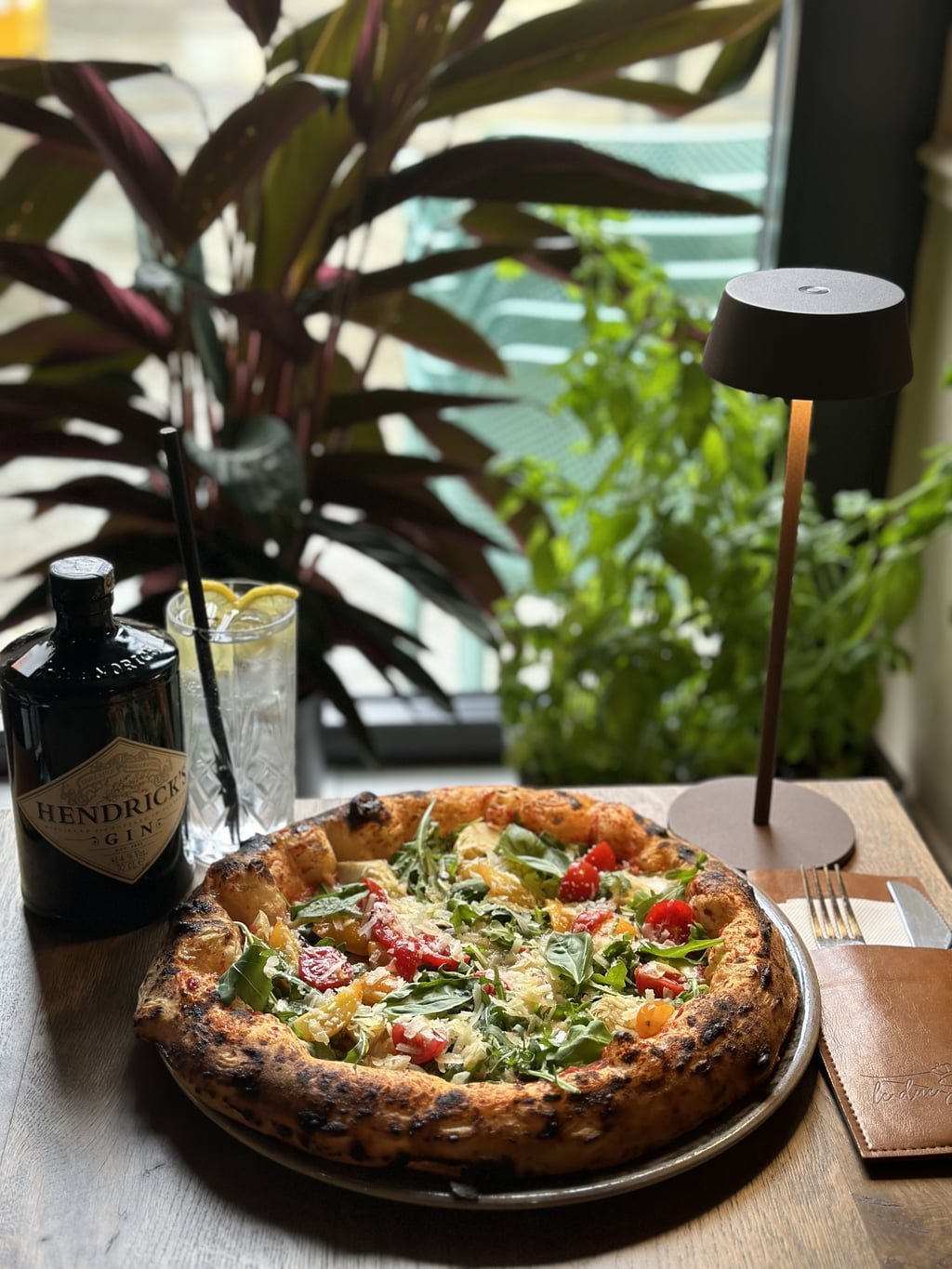 Paradajková omáčka, fior di latte, rukola, cherry paradajky, pecorino romano, balsamico glazúra, extra panenský olivový olej