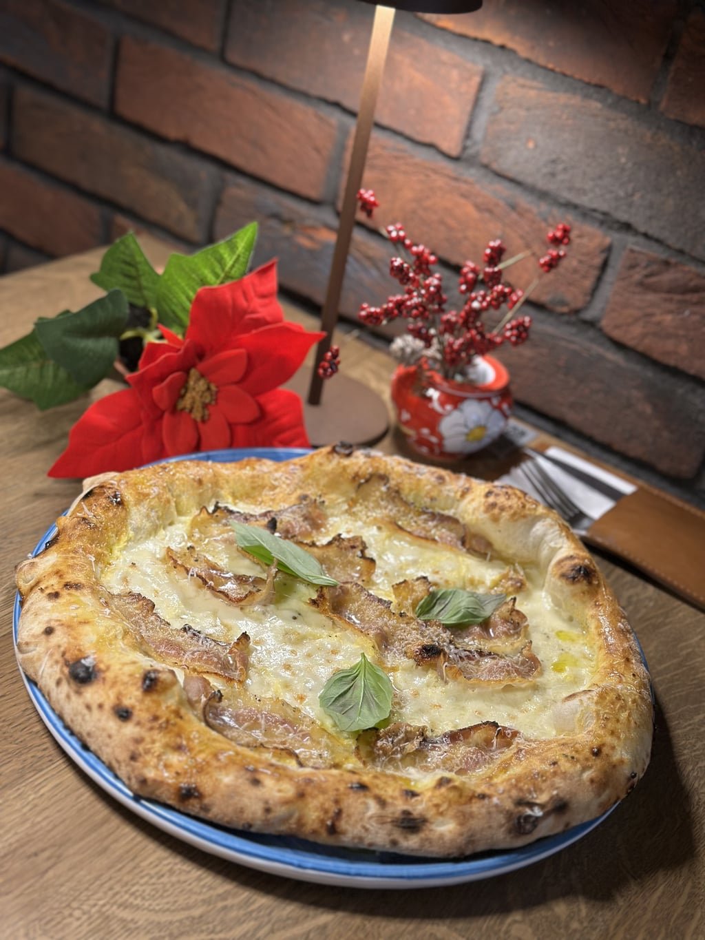 Fior di latte, chiodini huby, porchetta, zelené olivy, strúhaný pecorino, extra panenský olivový olej