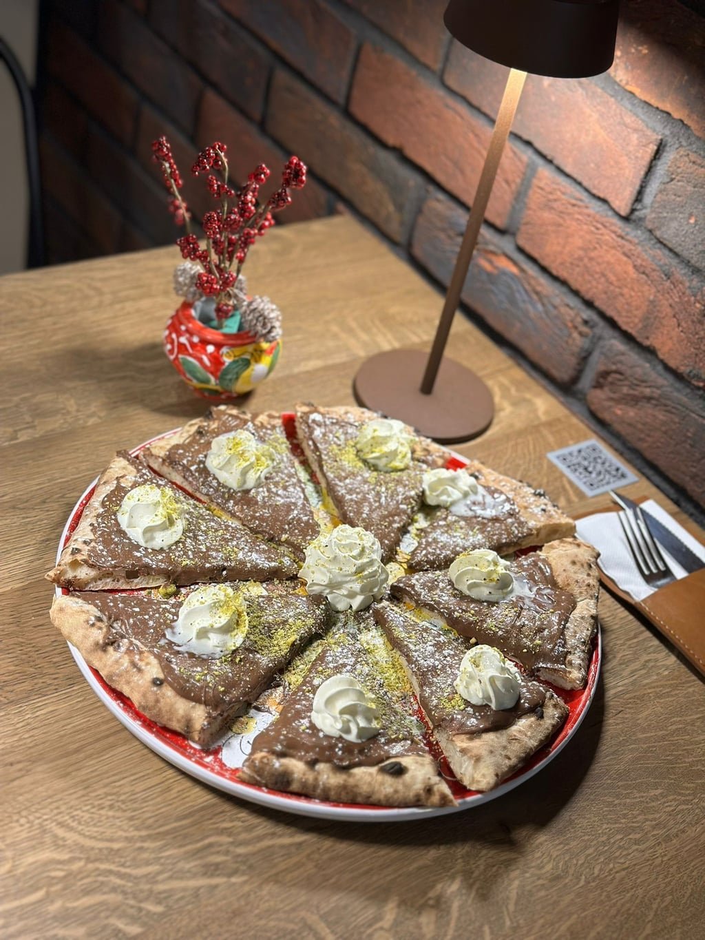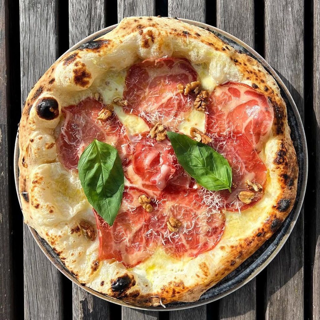 Paradajková omáčka, fior di latte, šunka, pesto genovese, pistácie, extra panenský olivový olej