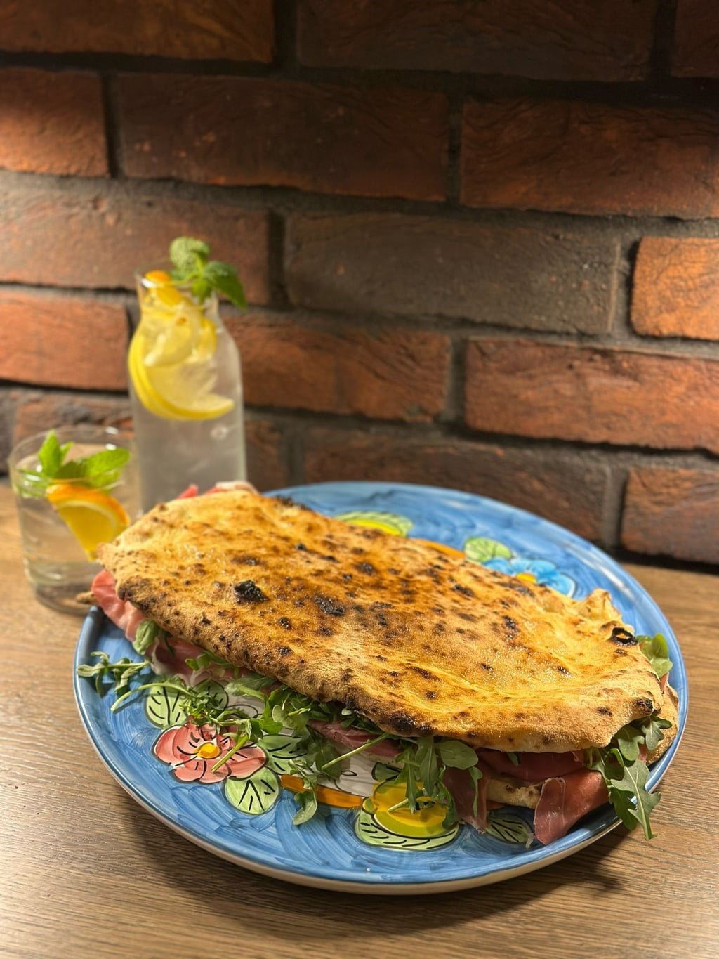 Zatvorený pizzový chlieb, fior di latte, rukola, San Daniele šunka, grana padano, extra panenský olivový olej