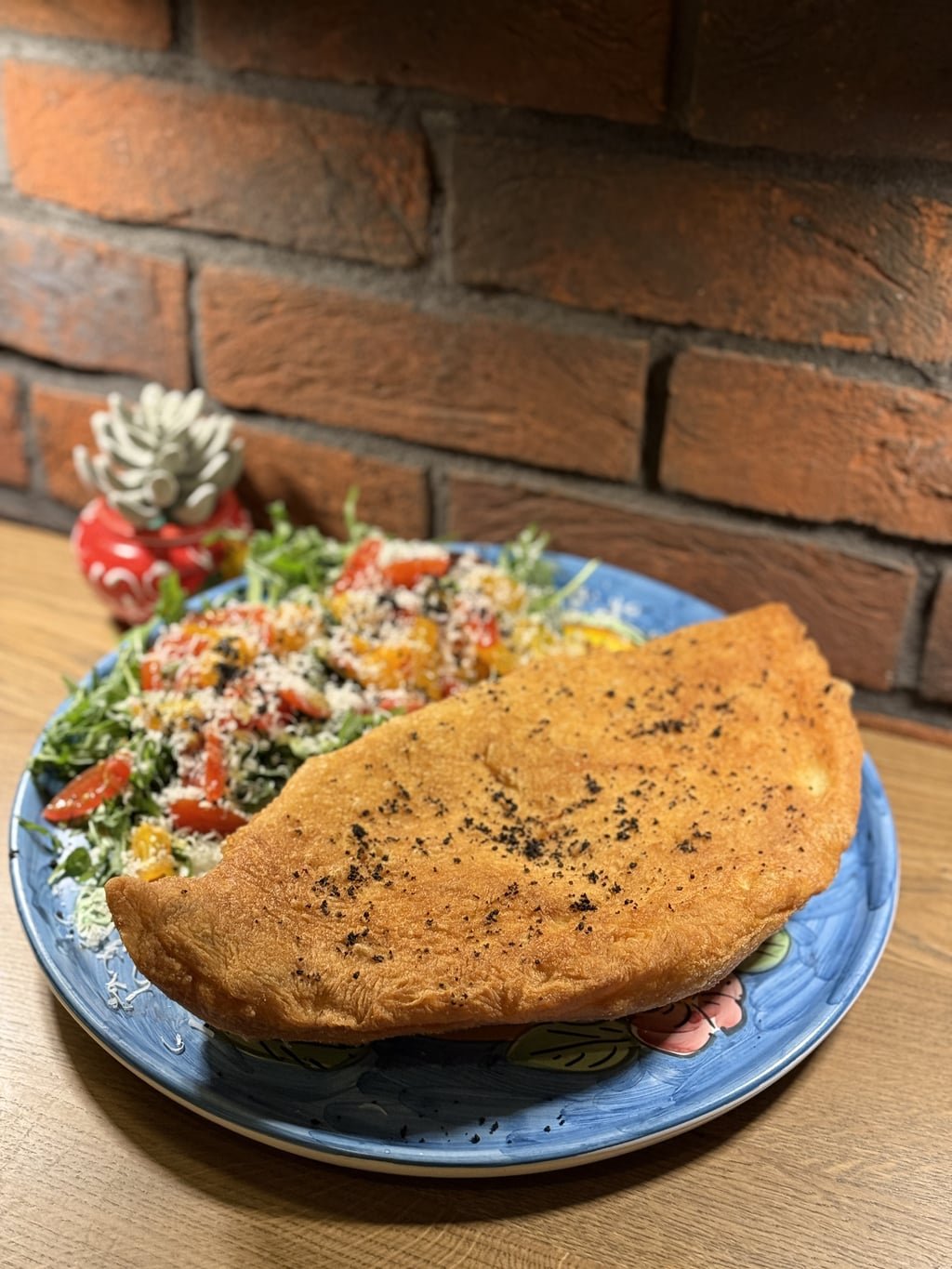 Zatvorená pizza plnená ricottou, fior di latte, salámou Napoli, čiernym korením a extra panenským olivovým olejom