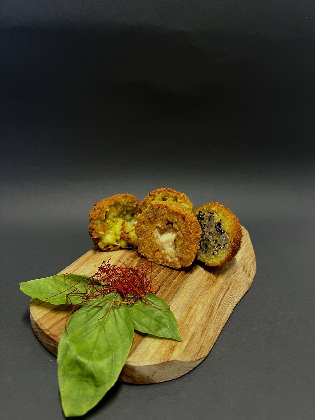 Zatvorená vyprážaná pizza, fior di latte, škvarky, ricotta, grana padano, sol, čierne korenie