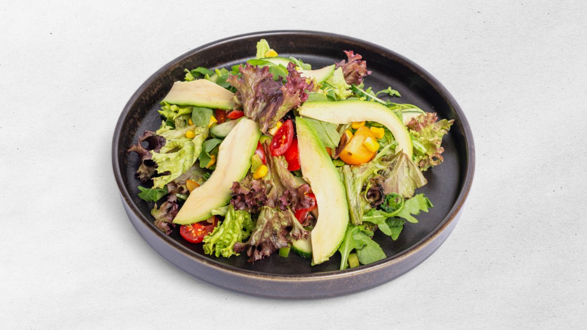 šalát, rukola, radicchio, cherry paradajky, čierne olivy-taggiasche, paprika, uhorka, kukurica, Avokado, Grana Padano + pečivo 300g / obsahuje:1, 7