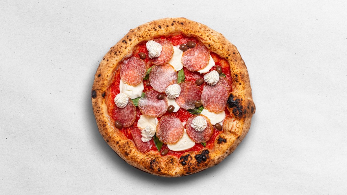 paradajková omáčka, pikantná saláma, mozzarella, olivový olej 550g / obsahuje: 1, 7