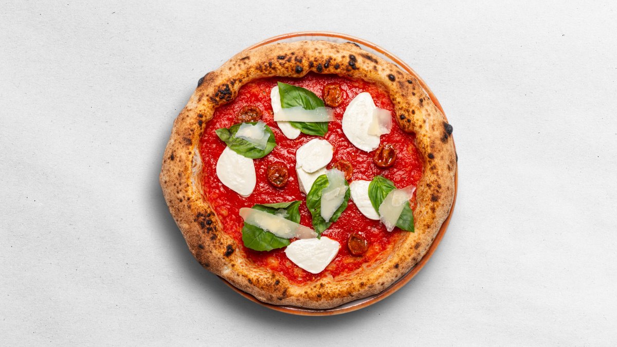 paradajková omáčka San Marzano, mozzeralla di bufala, polosušené paradajky, hoblinky Parmigiano Reggiano, bazalka, EVOO / 1,7