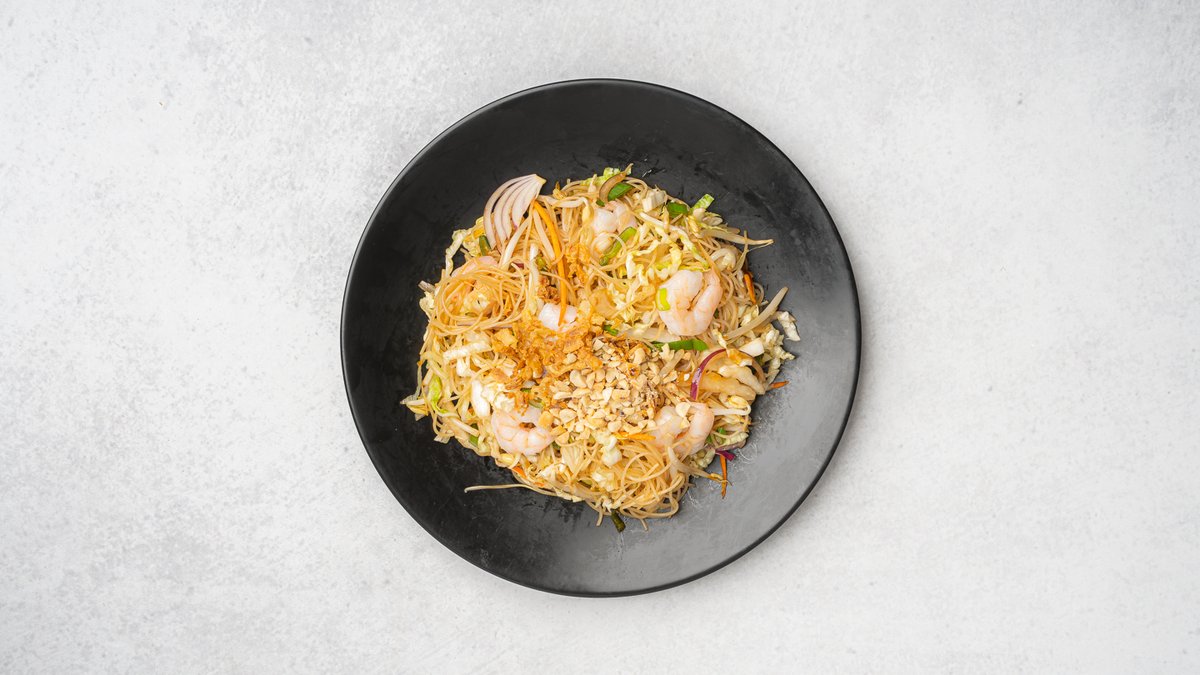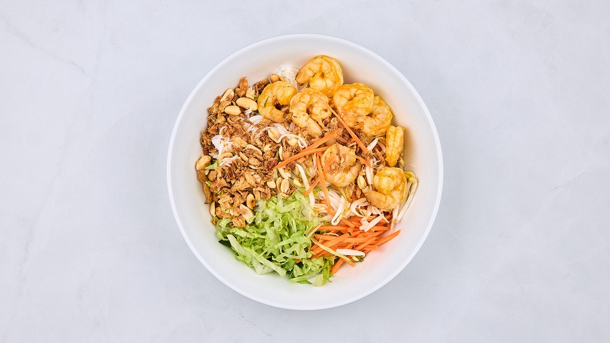 ryžové rezance, sójové klíčky, uhorka, mrkva, koriander, ľadový šalát, vietnamské bylinky, arašídy, pražená cibuľa, omáčka 450g / obsahuje: 4, 14