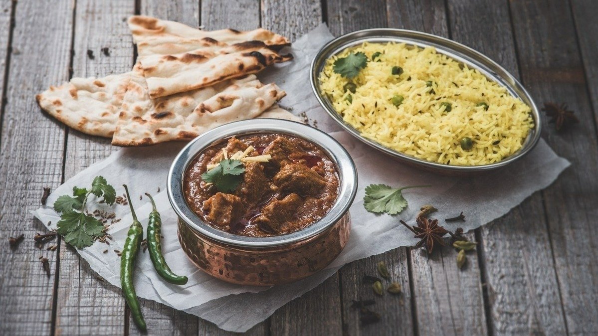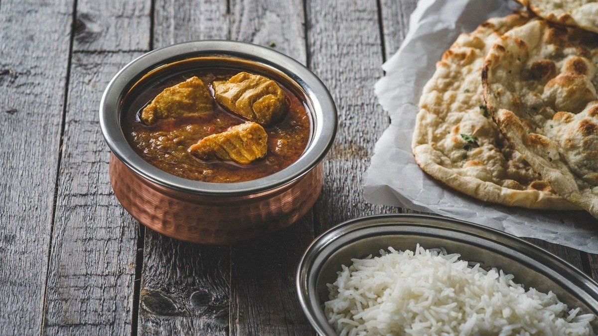 Cícer v rajčinovej omáčke a indickým korením, ryža alebo naan. Pálčivosť: 1 350g