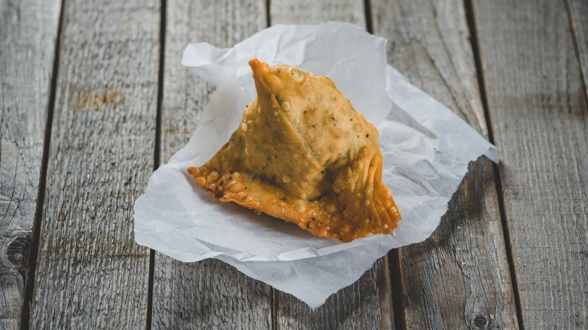 Samosa s cícerom a omáčkami. Pálčivosť: 0 200g / obsahuje: 7