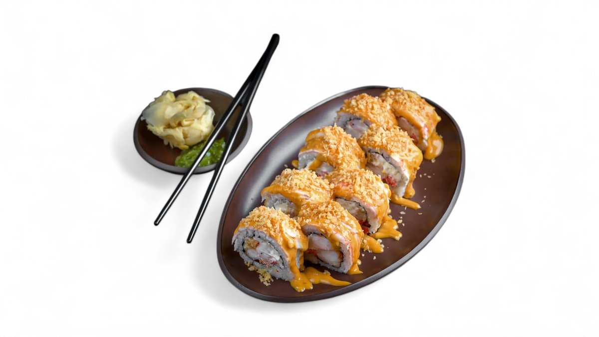 Nori, ryža, krémový syr, tigrie krevety, čerstvé uhorky, ikra tobiko, losos, zelená cibuľa. 330g / obsahuje: 1, 2, 4, 7