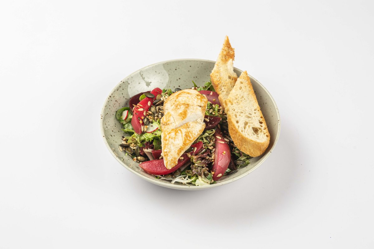 farebná reďkovka, pražené semienka, dresing z medu a horčice, hrianka 350 g / obsahuje: 1, 10, 12
