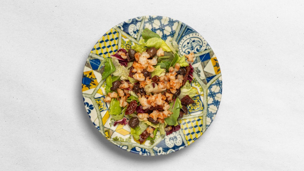 listový šalát, sušené paradajky, rukola, krevety, olivy 200 g / obsahuje: 2