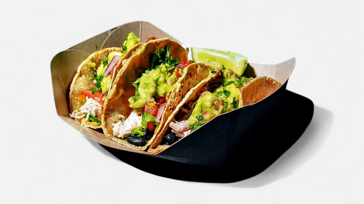 Kukuričná tortilla, šalát, fazula, paradajková salsa (obsahuje koriander), pomaly pečené kuracie , cheddar syr, guacamole (obsahuje koriander), koriander / obsahuje: 7