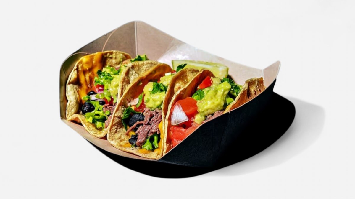 Kukuričná tortilla, šalát, fazula, paradajková salsa (obsahuje koriander), pomaly pečené hovädzie , cheddar syr, guacamole (obsahuje koriander), koriander / obsahuje: 7