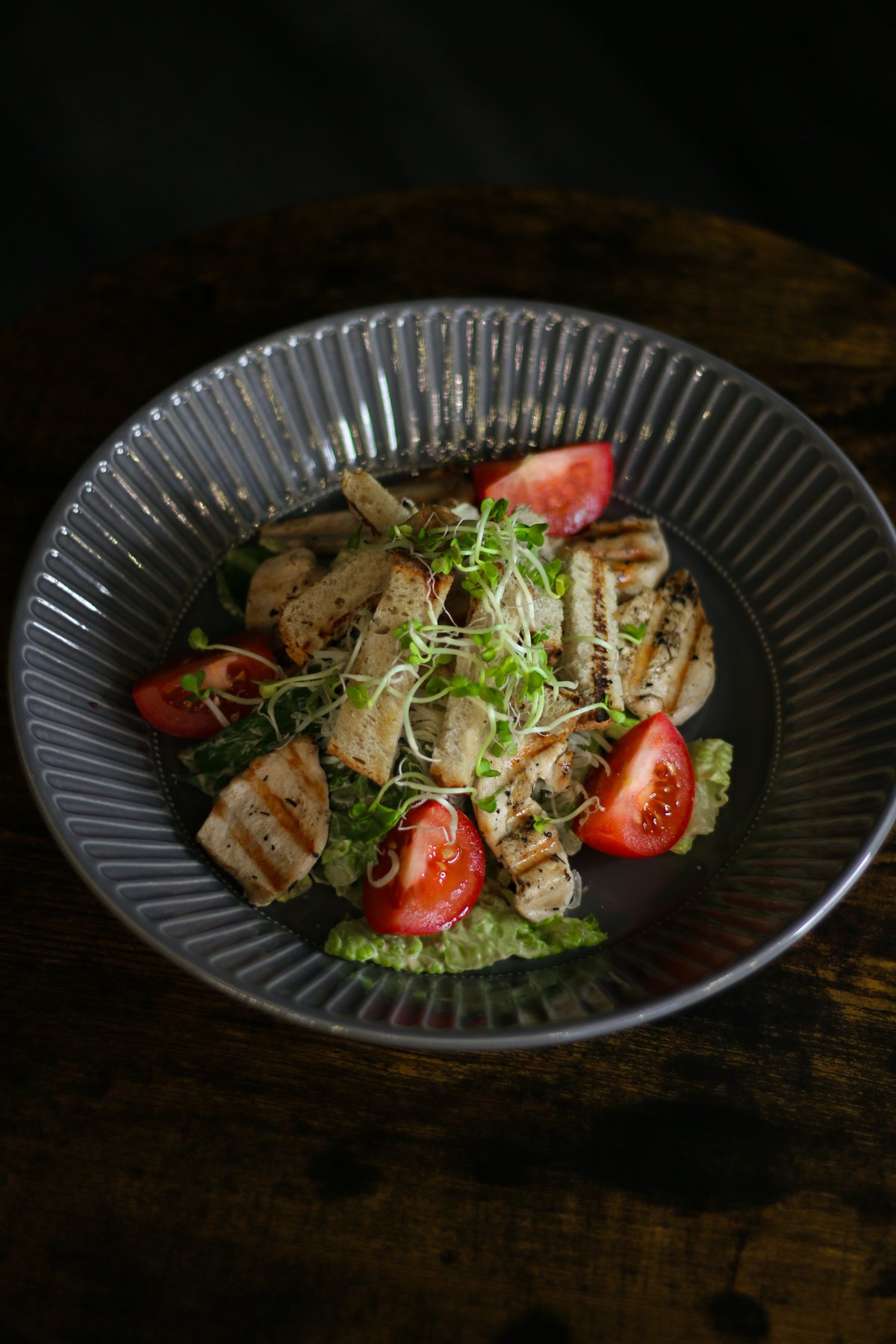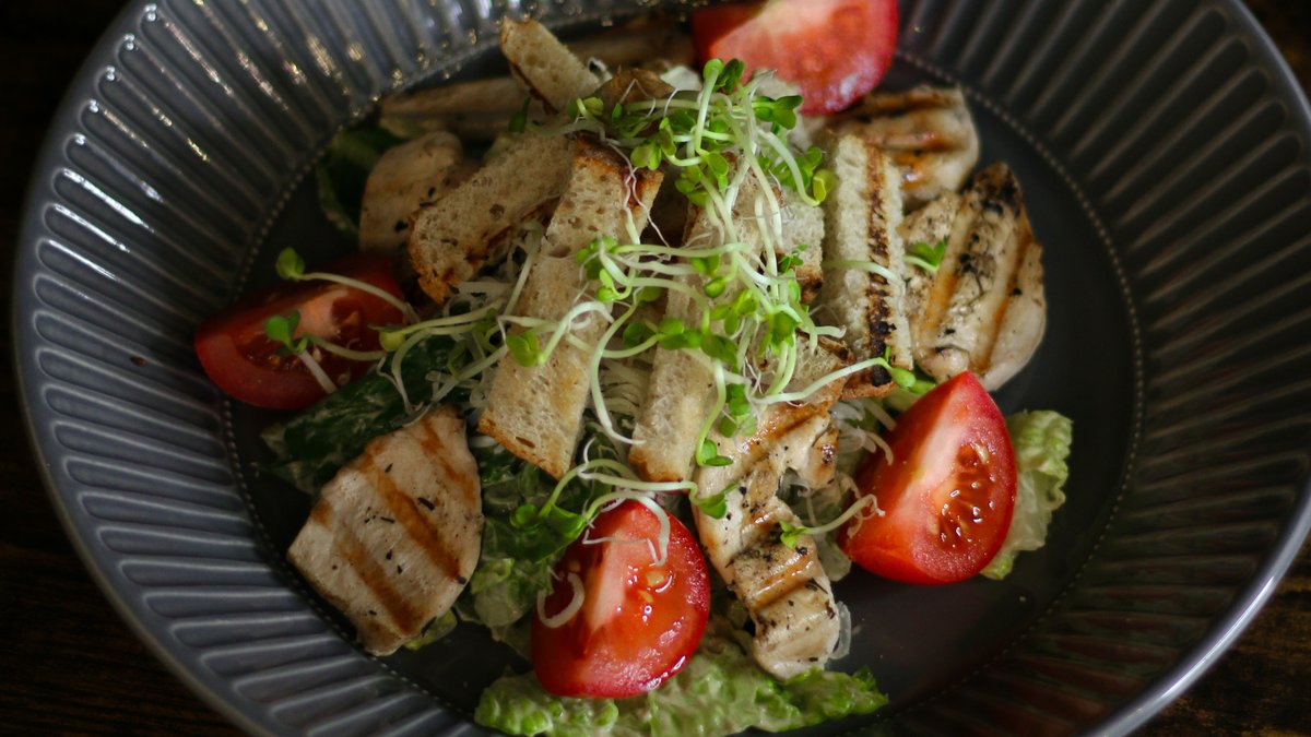 kuracie maso, ľadový šalát, paradajky, parmezán, francúzska omáčka, hrianky, korenie 360 g obsahuje alergény 7, 1