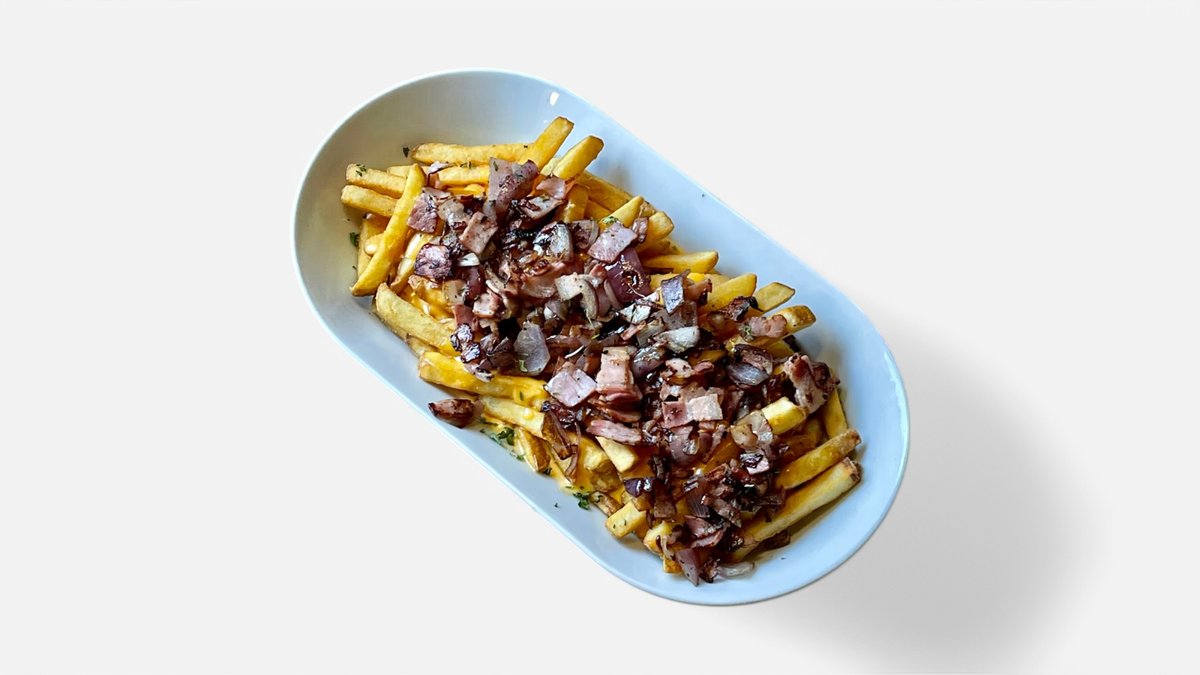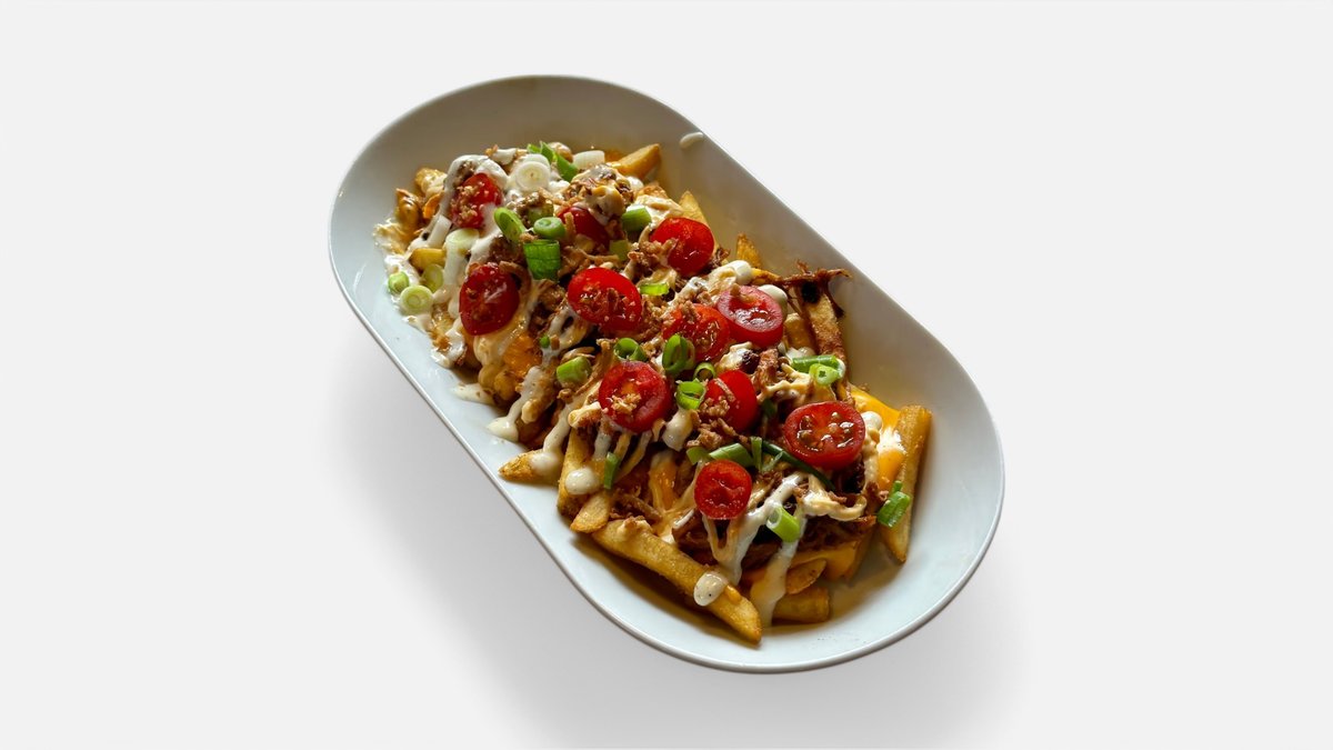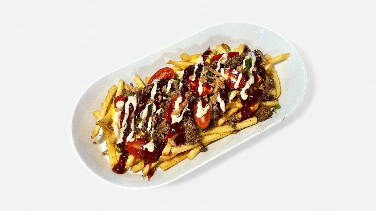 hranolky, trhané mäso, cheddarová omáčka, slaninový dip, aioli dip, opražená cibuľka, jarná cibuľka, cherry paradajky 150g / obsahuje: 7