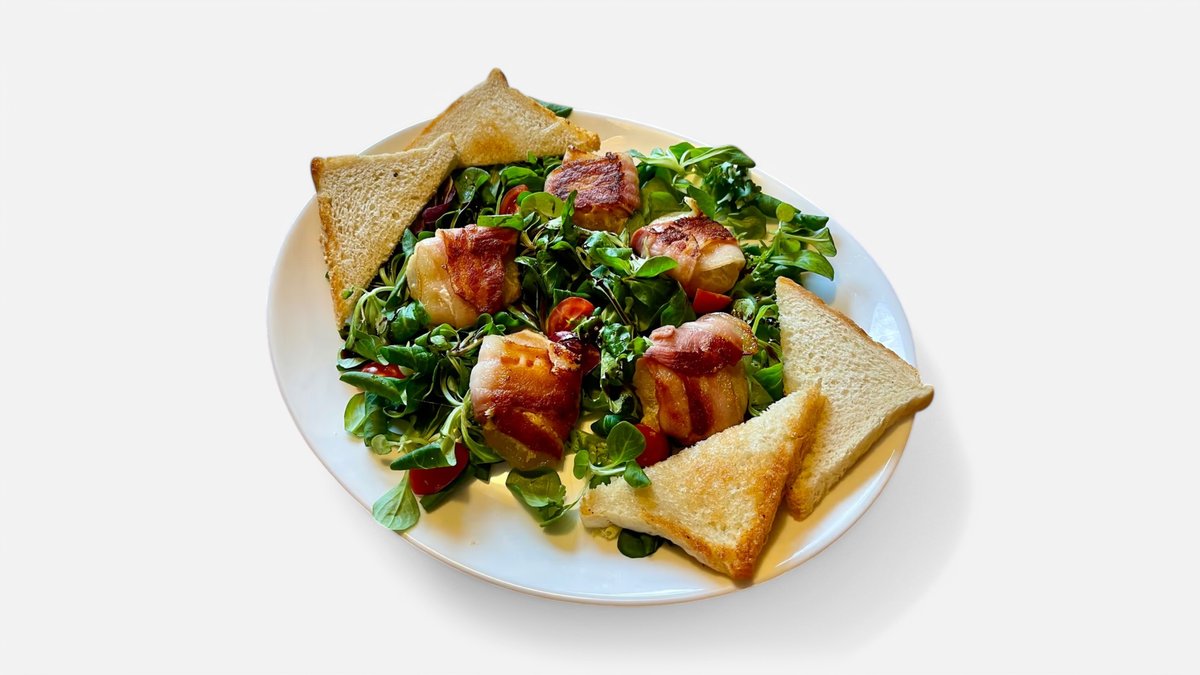 obalené slaninkou na listovom hniezde s marinovanou cibuľkou, toast 100g / obsahuje: