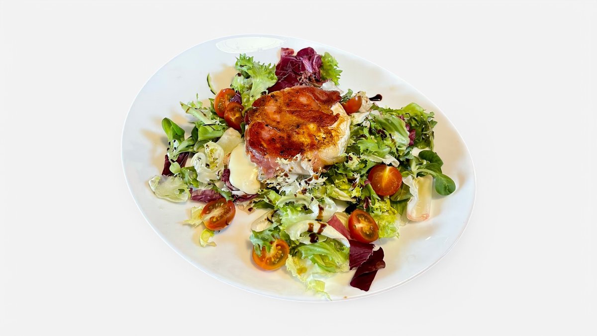 grilovaný kozí syr, vlašské orechy, zmes listových šalátov, cherry paradajky, uhorka, olivy, koktailový dressing, medový toast 100g / obsahuje: 1, 7, 8