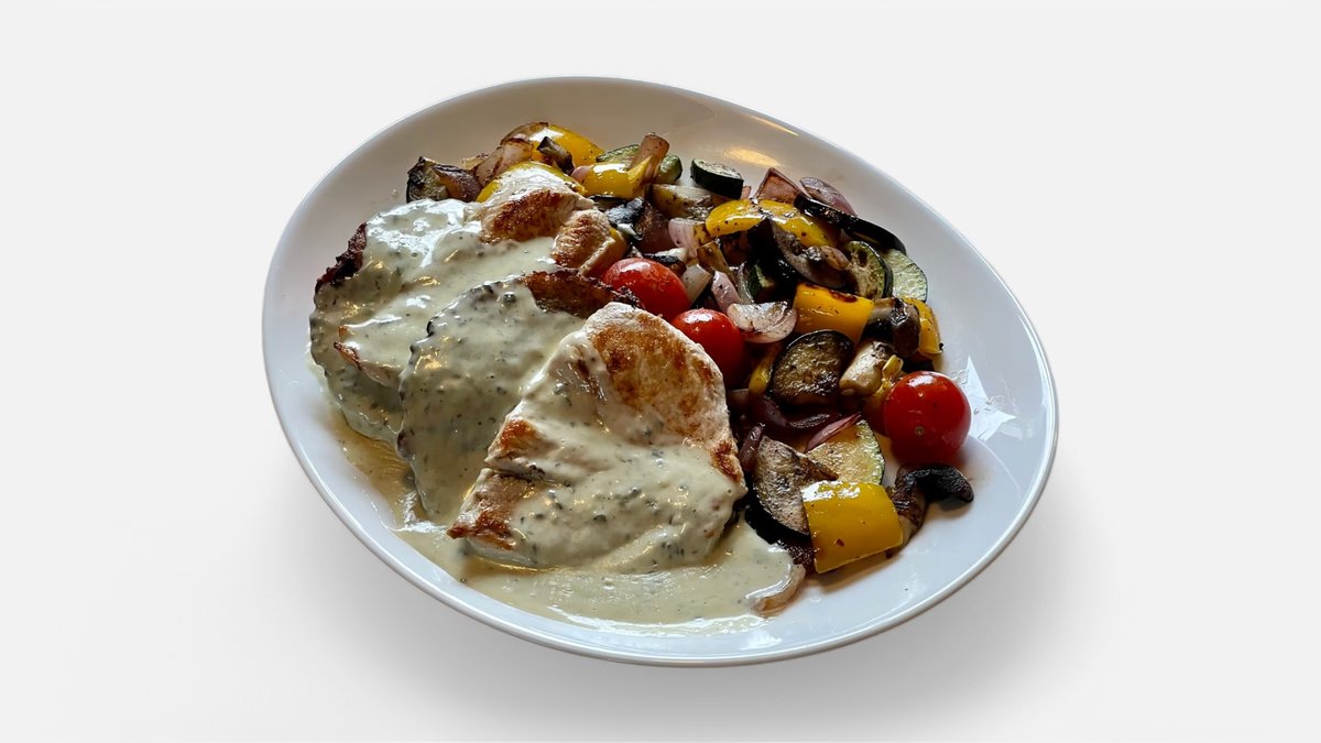 kuracie mäso, grilovaná zelenina, zemiakové placky, nivová omáčka 200g / obsahuje: 1, 3, 7