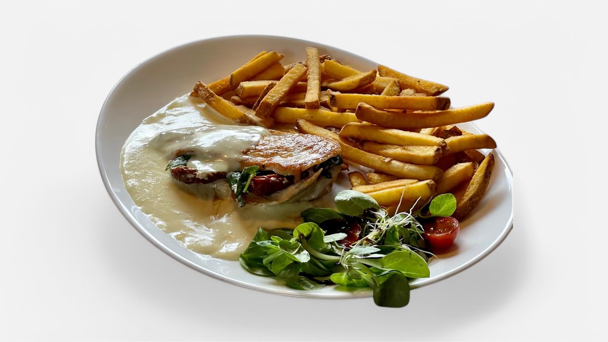 prírodné kuracie prsia plnené sušenou paradajkou, rukolou a syrom, s parmezánovou omáčkou 150g / obsahuje: 7