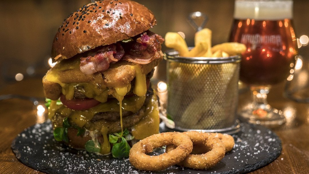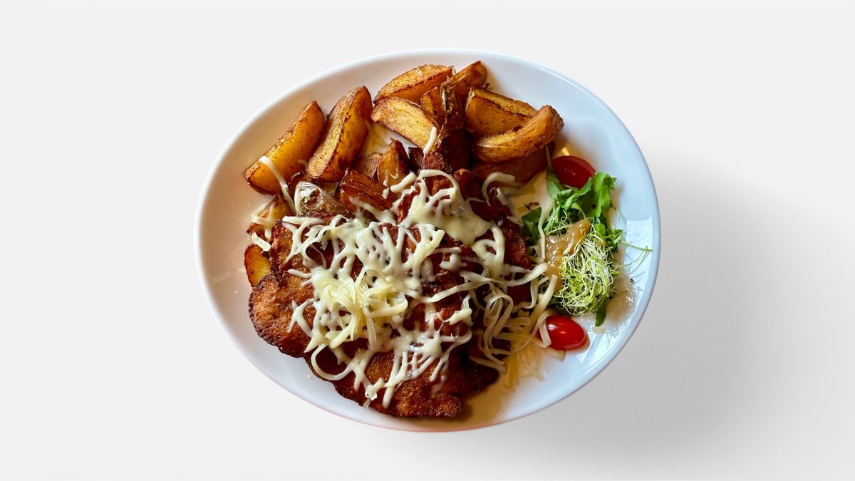 3x hovädzí krk, trojitý cheddar, vyprážaný cheddar, zemiaková placka, pečená slaninka, čerstvá paradajka, šalát, polníček, BBQ omáčka 450g / obsahuje: 1, 3, 7, 11, 12