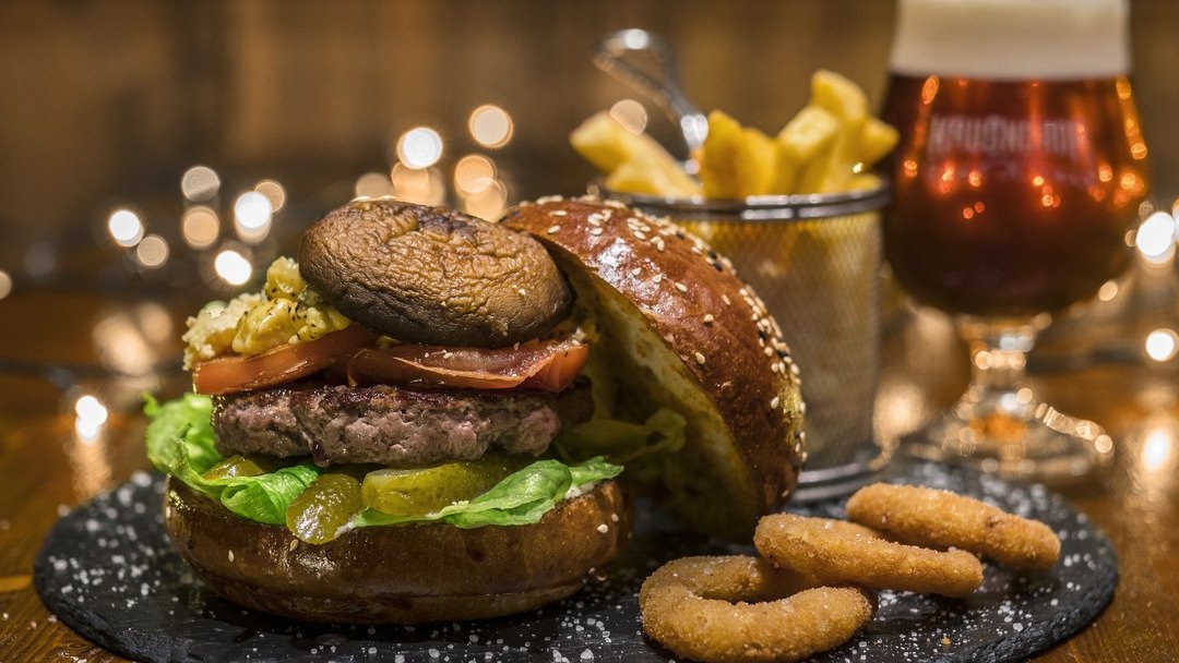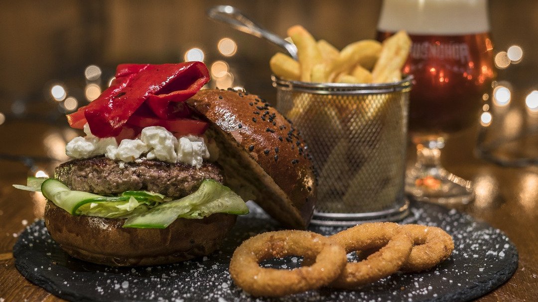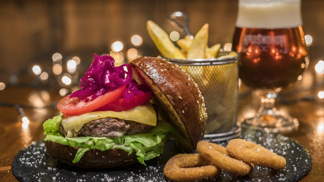 hovädzí krk, cheddar, volské oko, čerstvá paradajka, nakladaná uhorka, medová cibuľka, sezamová majonéza, šalát 150g / obsahuje: 1, 3, 7, 11