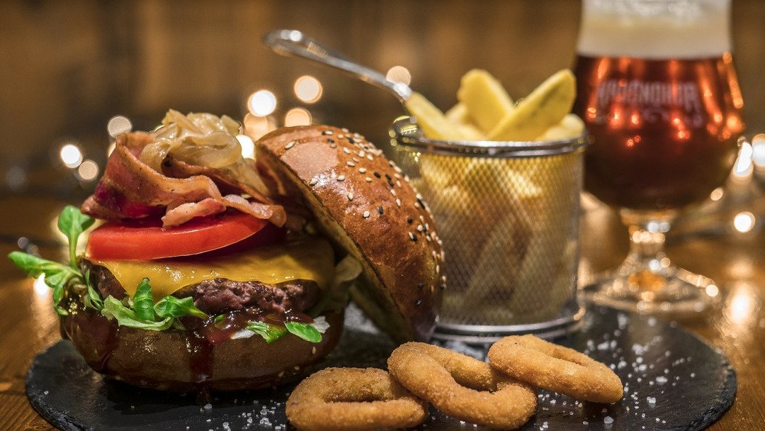 hovädzí krk, cheddar, pečená slaninka, medová cibuľka, domáca BBQ omáčka, čerstvá paradajka, šalát, polníček 150g / obsahuje: 1, 7, 11, 12