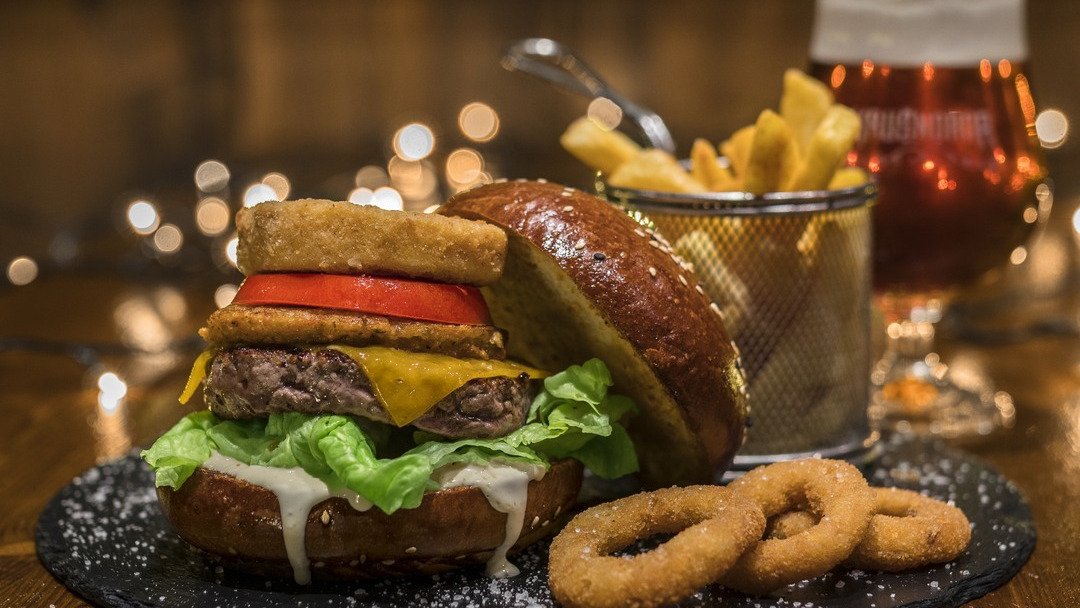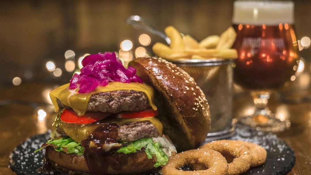 2x hovädzí krk, dvojitý cheddar, čerstvá paradajka, červená cibuľka, slaninový džem, aioli majonéza, BBQ, šalát 300g / obsahuje: 1, 7, 11, 12