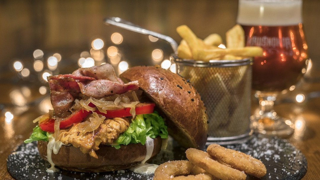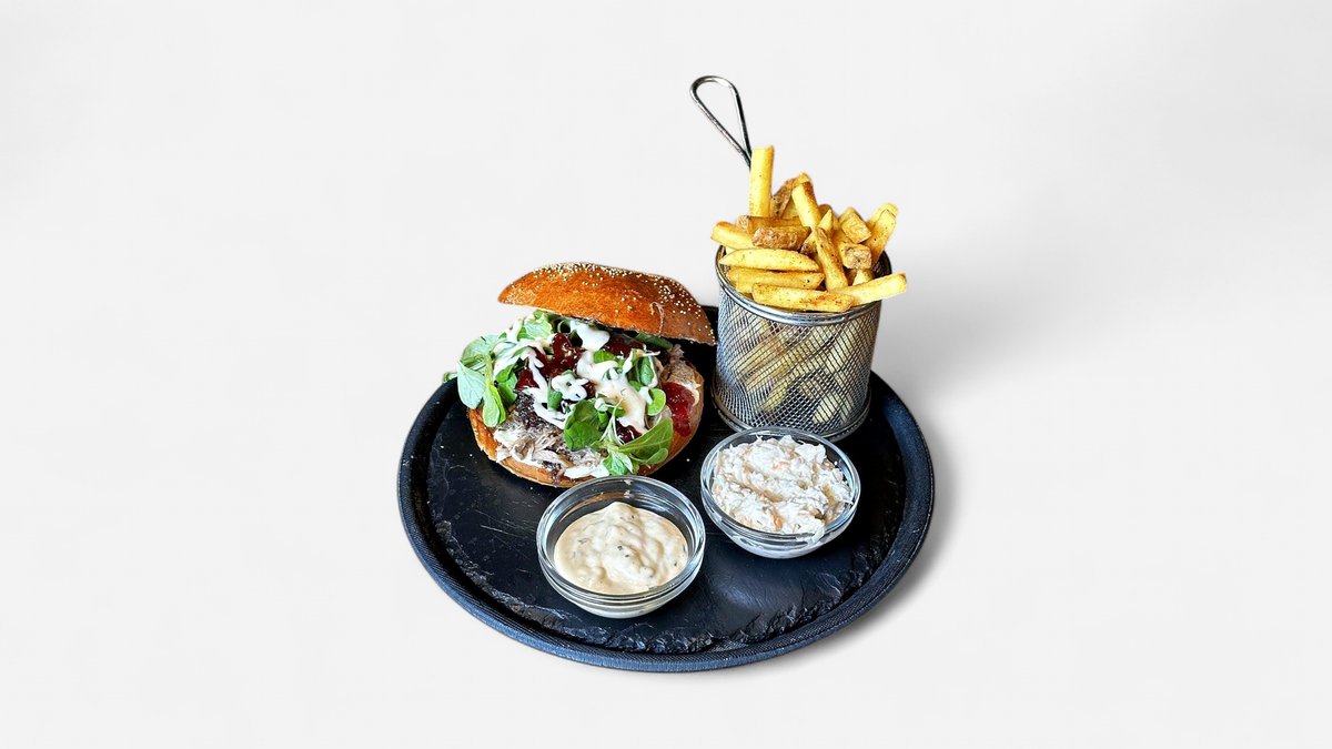 Maslová žemľa s lieskovcom, majonéza z čierneho korenia, pomaly pečená trhaná kačka, cibuľové chutney, poľníček, brusnice, konfitovany cesnak s bylinkami. Burger je podávaný s hranolkami, coleslaw šalátom a omáčkou podľa vlastného výberu. AJ BEZLEPKOVÁ VARIANTA