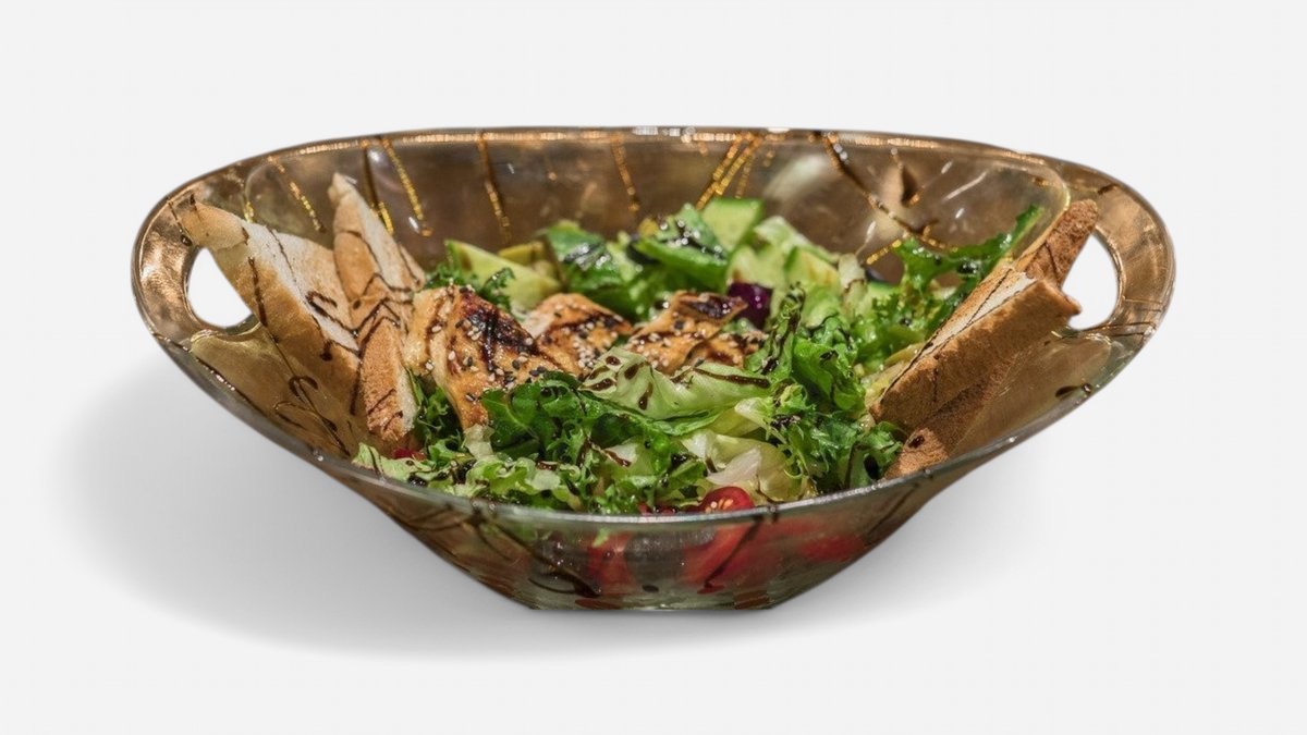 marinované kuracie prsia, mini mozzarella, zmes listových šalátov, rukola, cherry paradajky, uhorka, olivy, parmezánový dressing, medový toast 150g / obsahuje: 1, 7, 12
